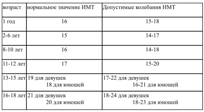 Для постановки диагноза ожирение используется расчёт индекса массы тела (ИМТ) и степени его отклонения. Рассчитать ИМТ очень легко: вес (в кг) поделить на рост (в м) в квадрате. Например, при росте 140 см и весе 32 кг ИМТ = 32: 1,42 = 16. Приведена ориентировочная таблица нормальных значений ИМТ для детей разных возрастов.